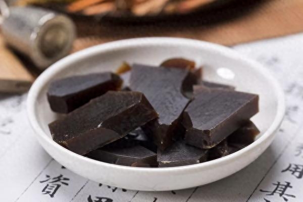 3、阿胶提前24小时放入黄酒中,烊化后放入药汁中,搅匀成膏即可。